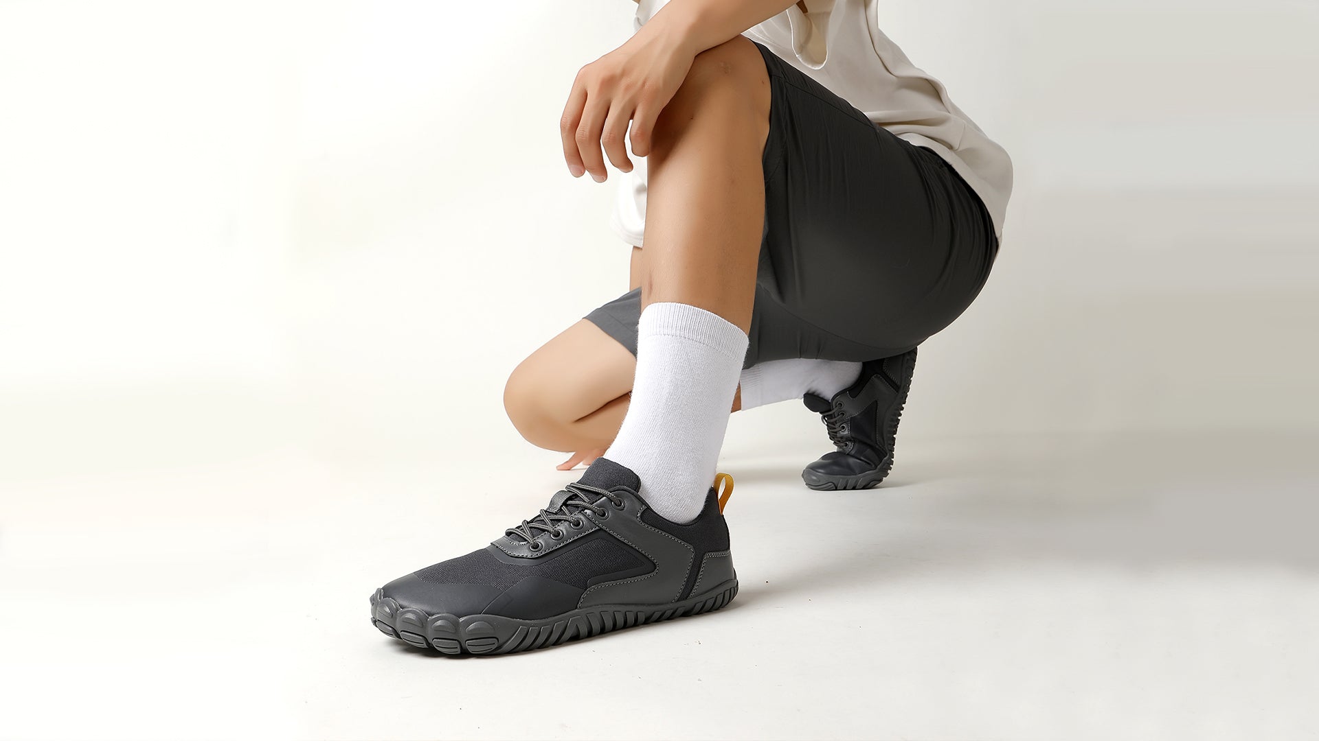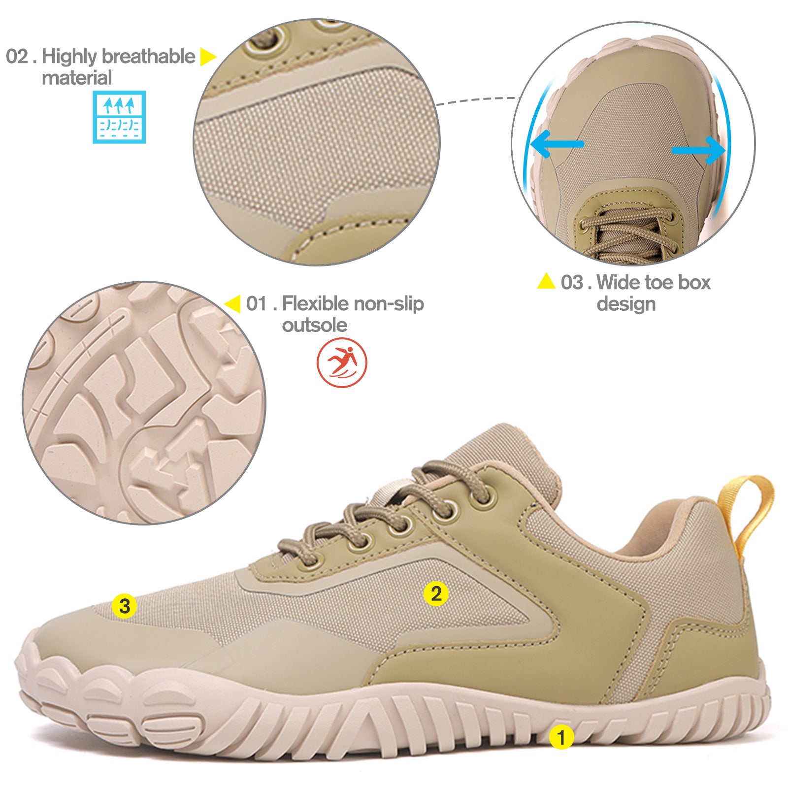 This barefoot wide-last hiking shoes pair lightweight materials with high-level protection. Featuring a water-resistant Oxford + microfiber + TPU upper, four-way stretch lining, invisible cotton insole, and a five-toe rubber outsole with multi-directional anti-slip texture, these shoes keep your feet dry, comfortable and confidently planted across mountain paths, river crossings, and urban routes.