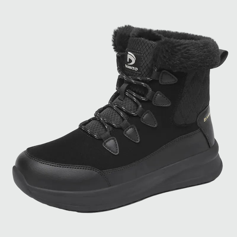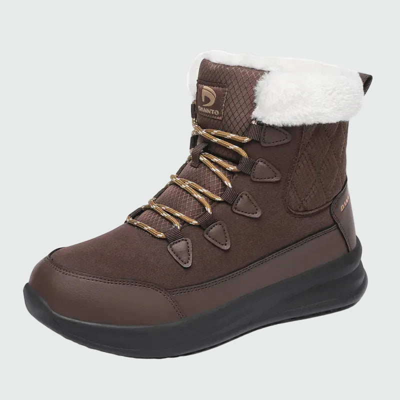 20 SEC WATCH :DANNTO winter boots are built for snowy adventures with a durable, water-resistant upper, cozy fur lining, secure fit, cushioned arch support, and a grippy rubber sole for stability on icy or rugged terrain.